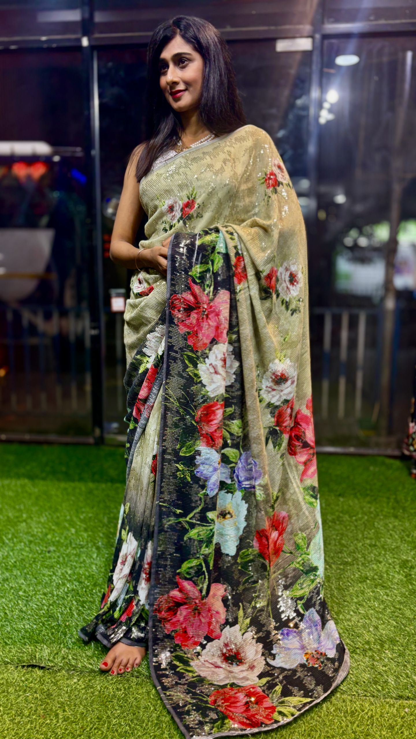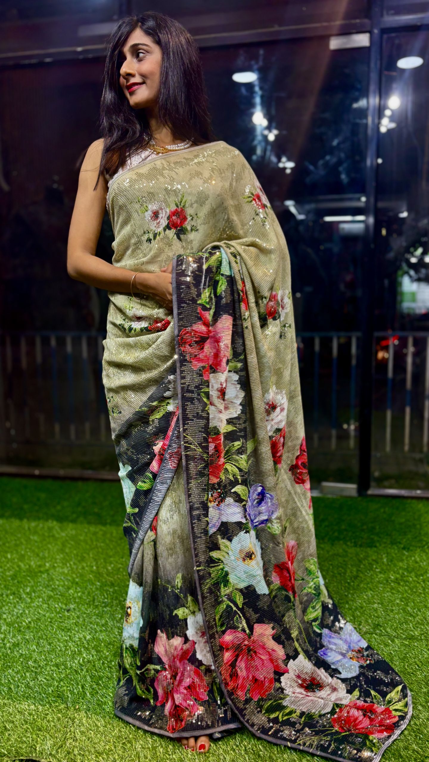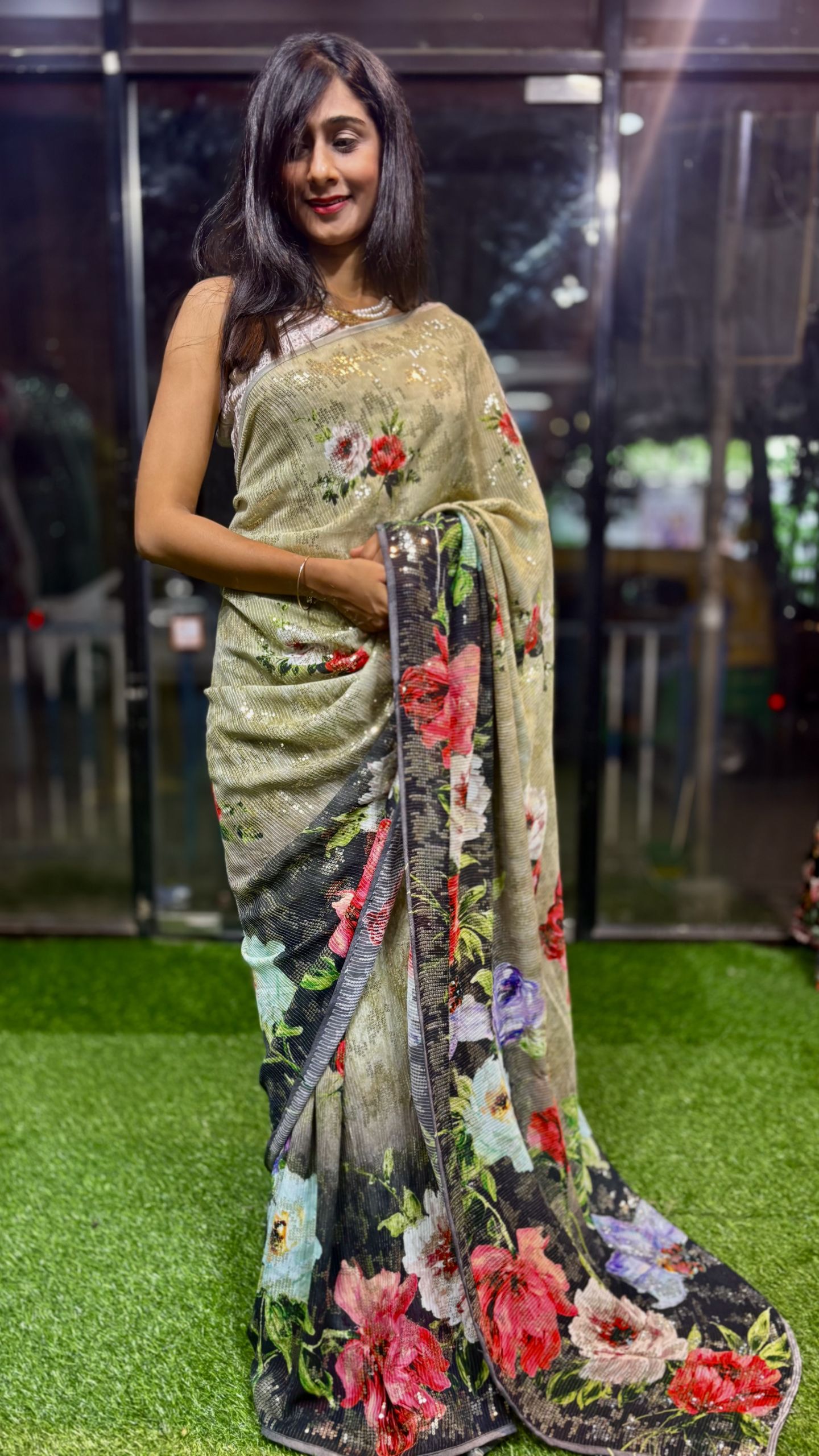 Flowy, weightless & body-hugging Floral Digital Printed Pure Georgette Sequence Saree designed for graceful movement and glam shine. Comes with a Black plain blouse for a classy contrast look. Perfect for parties, festive vibes & special evenings.