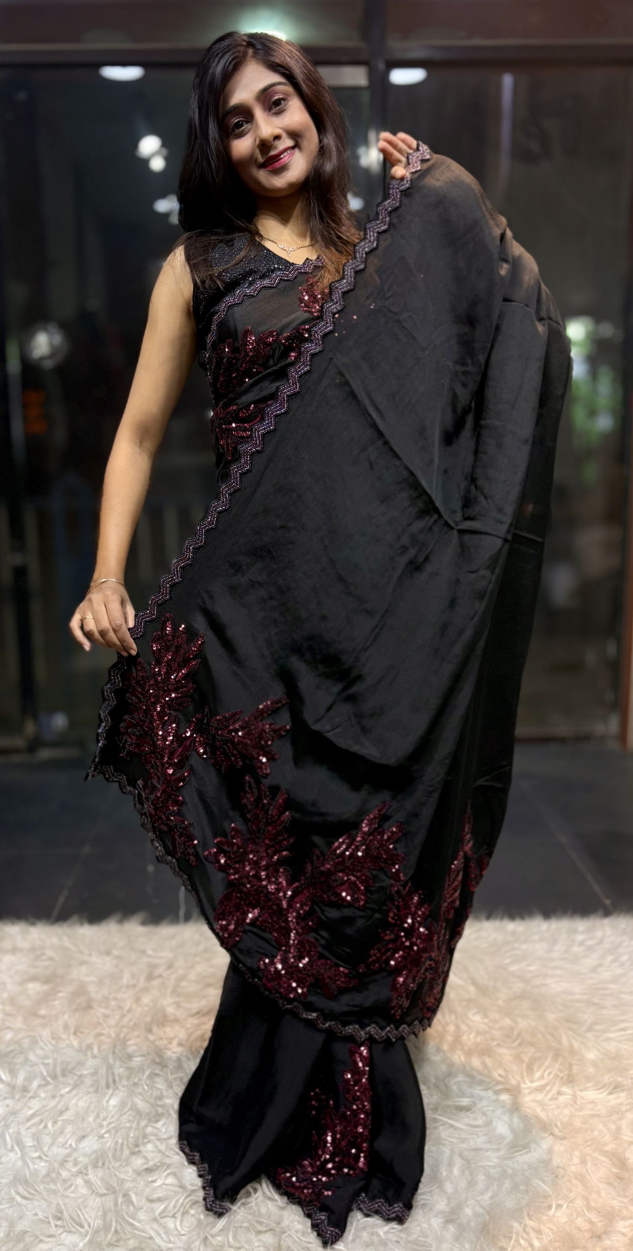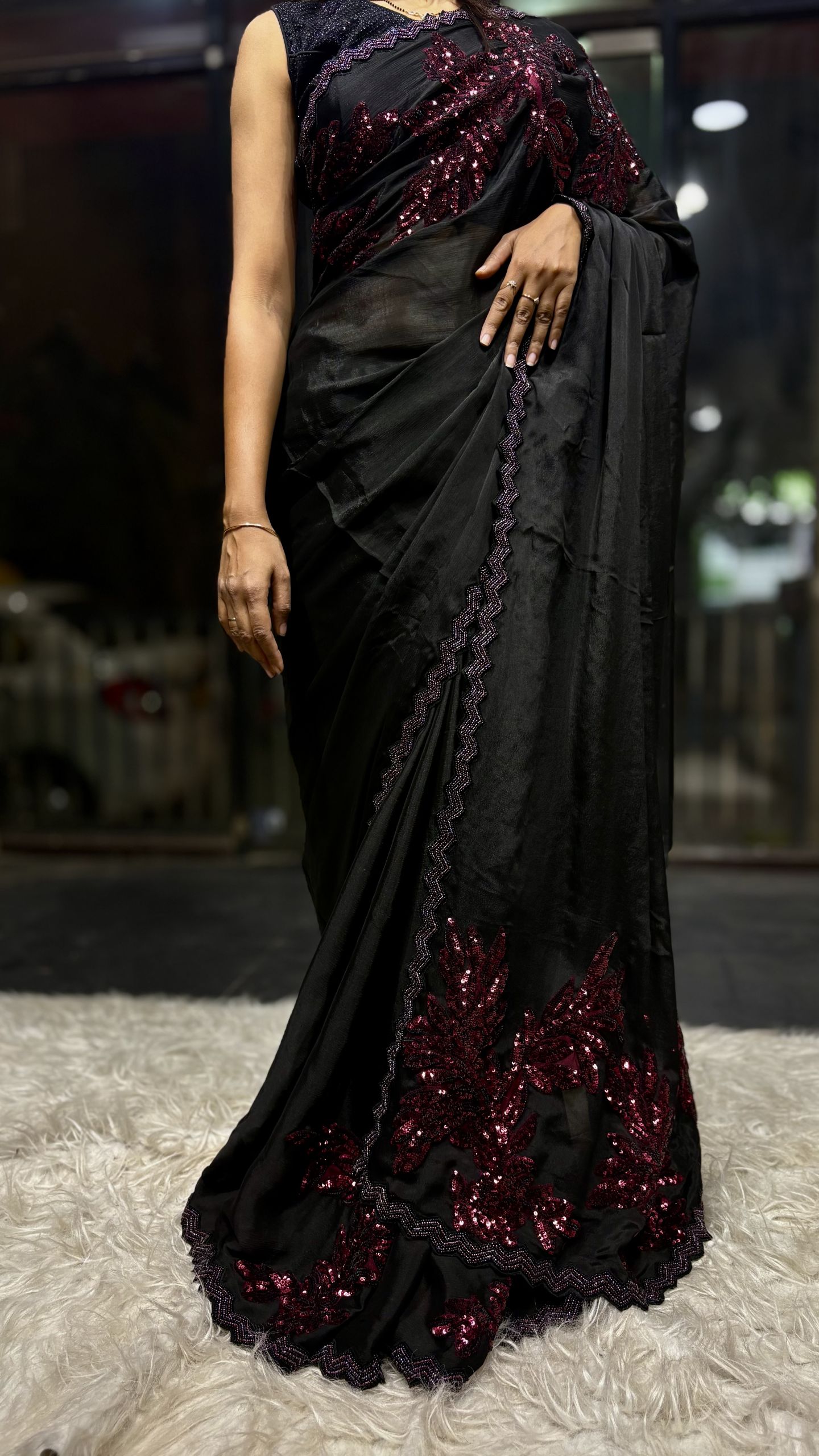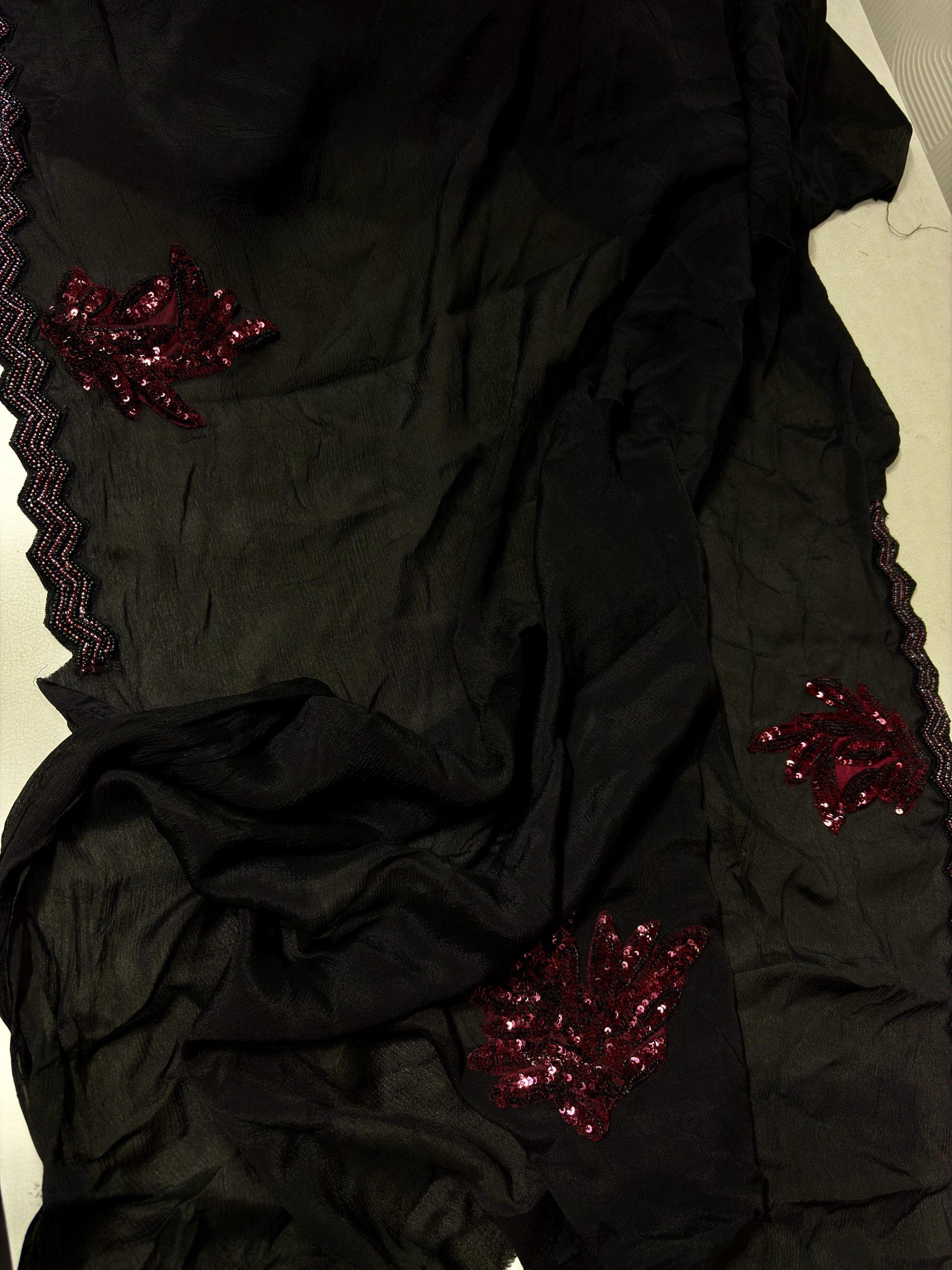 Soft, body hugging black saree adorned with elegant maroon leaf sequence appliqué work for a classy, slimming & glamorous look ✨