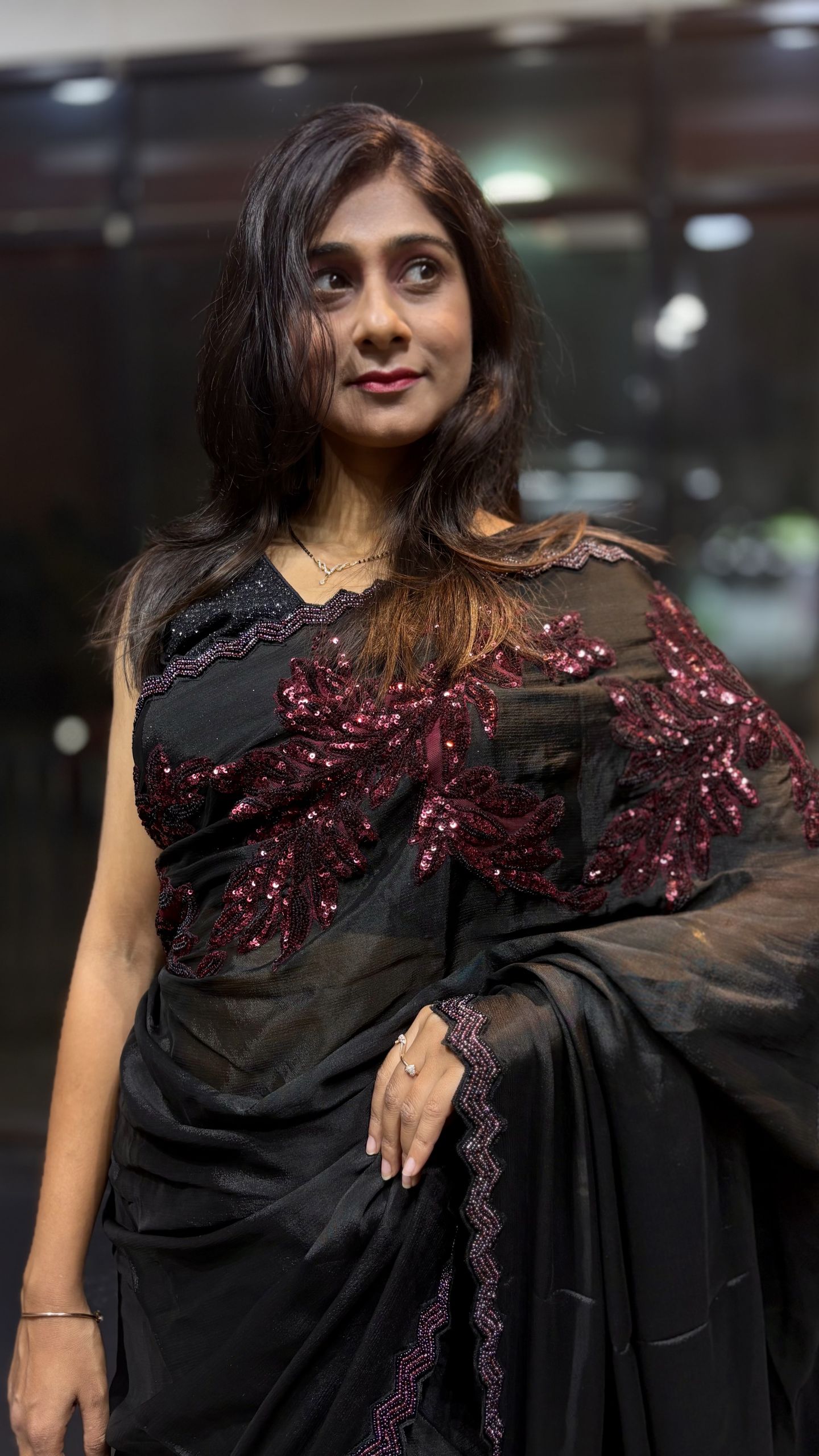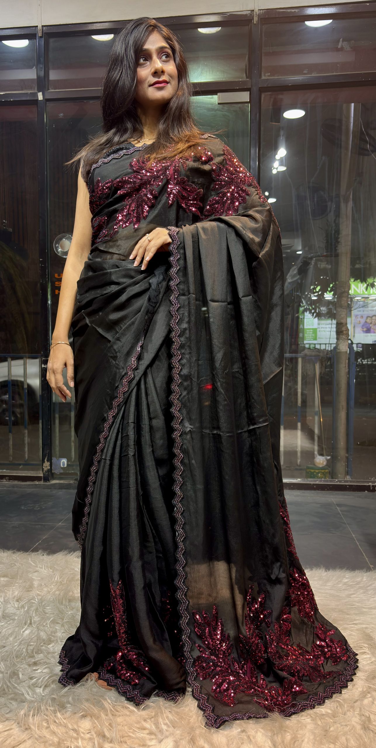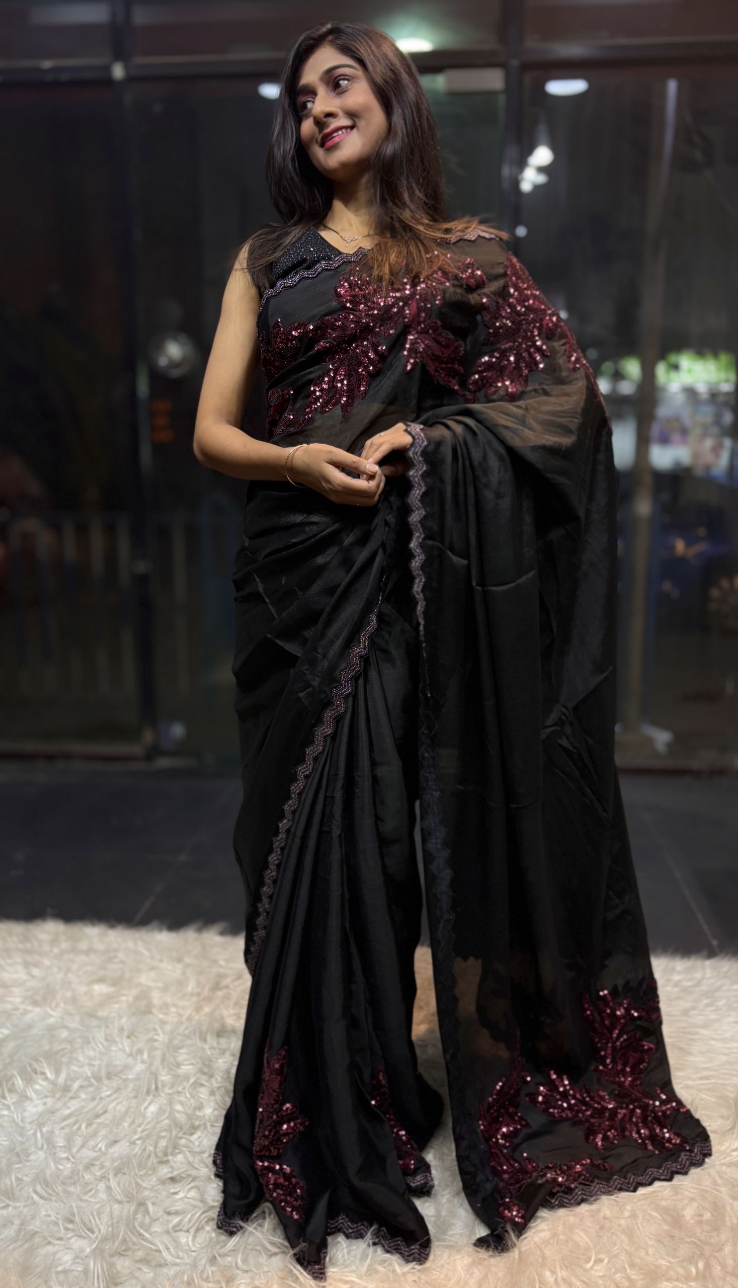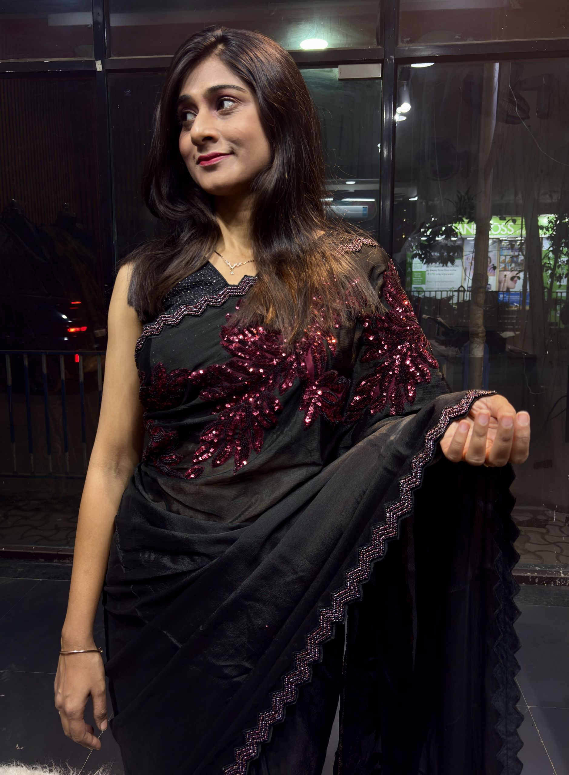 Soft, body hugging black saree adorned with elegant maroon leaf sequence appliqué work for a classy, slimming & glamorous look ✨