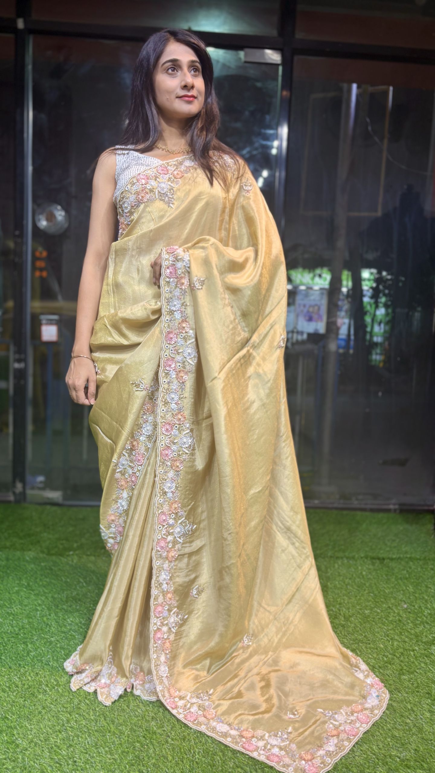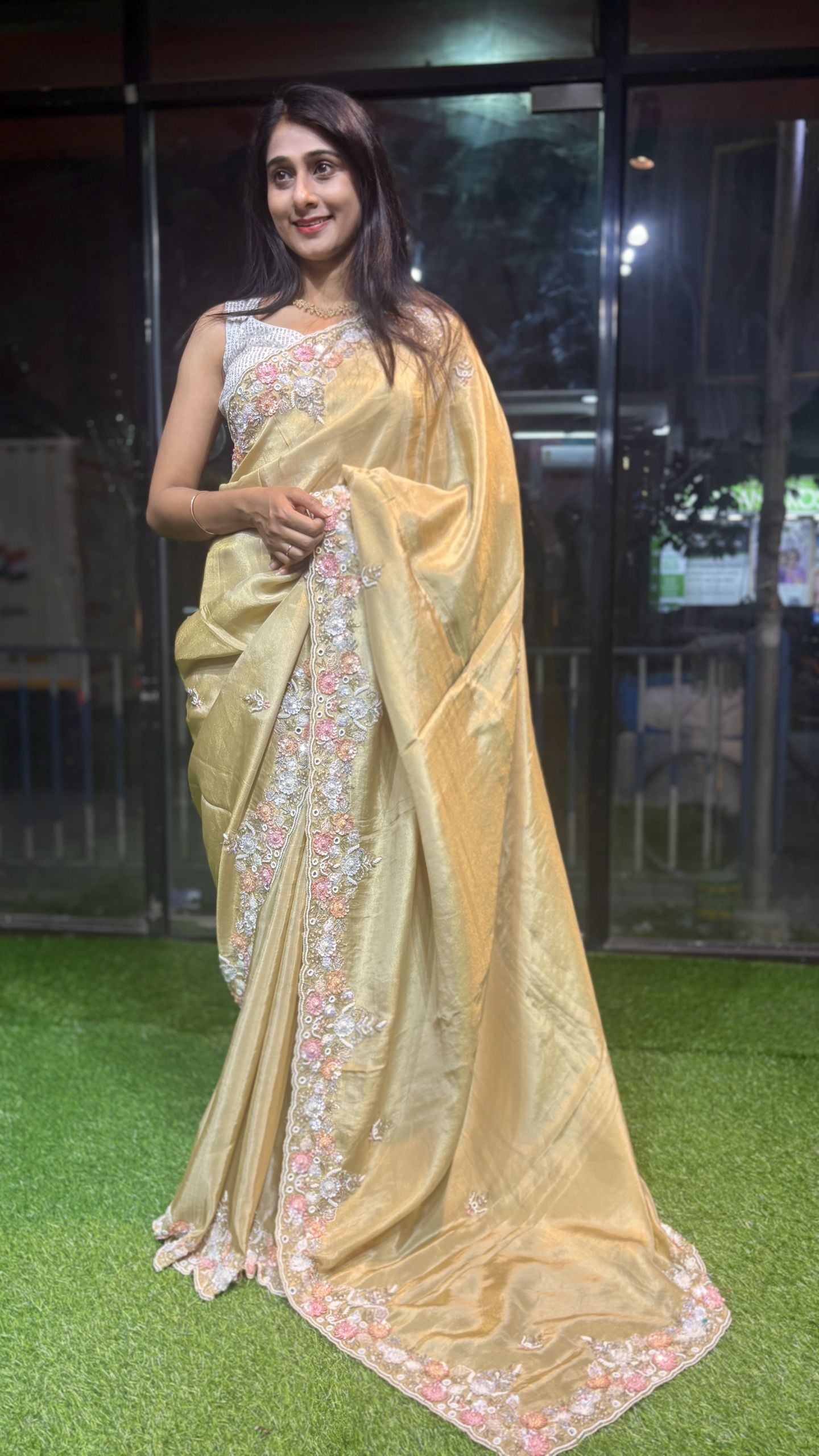 Crafted in soft, body-hugging Pure Kanchi Crepe Tissue Silk, this saree dazzles with multicolored sequins, pearls, zarkan stones, and cutdana heavy handwork. A beautifully detailed scalloped border and elegant allover handwork buttas create a timeless statement of grace, luxury, and celebration-ready charm.