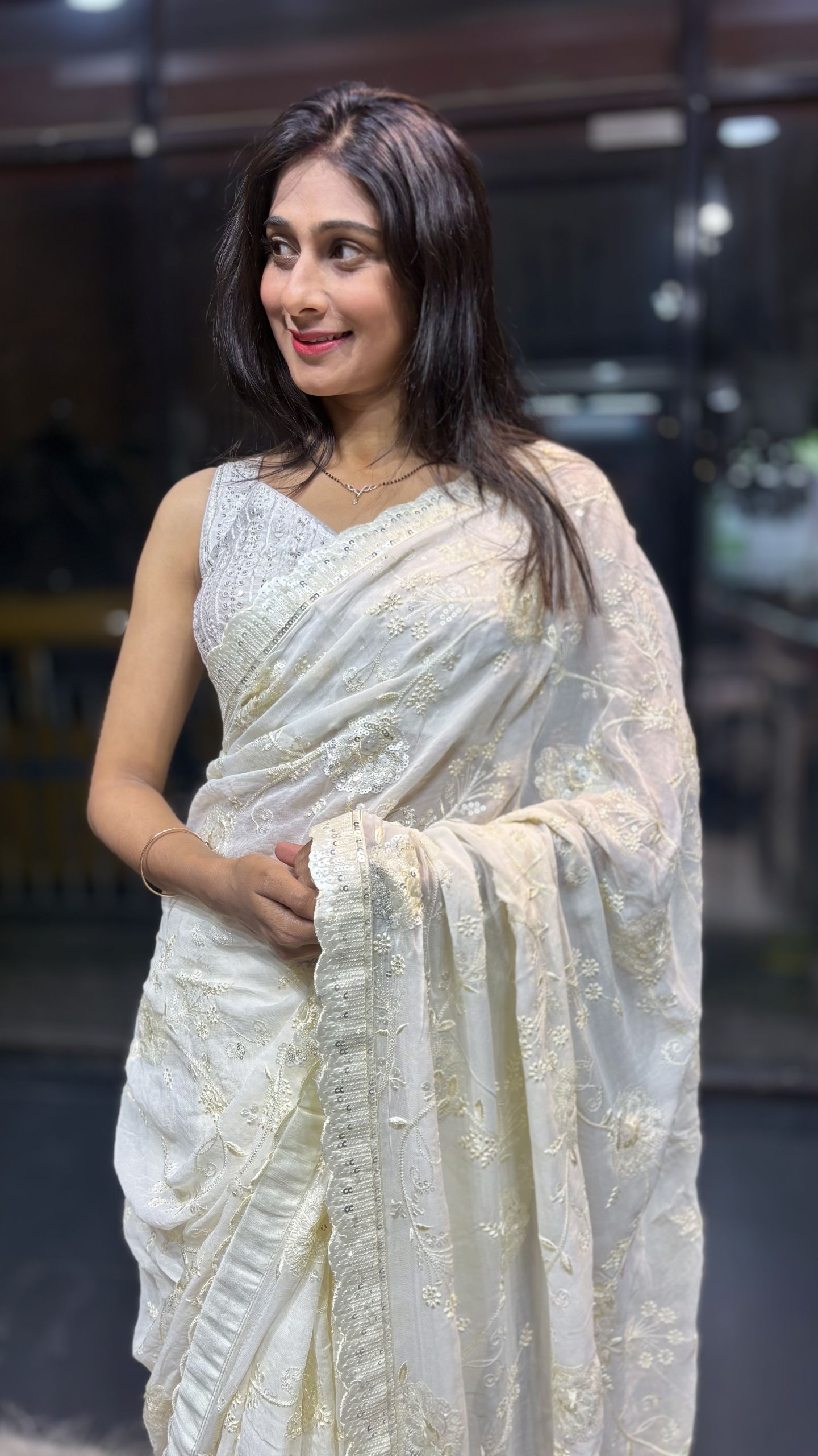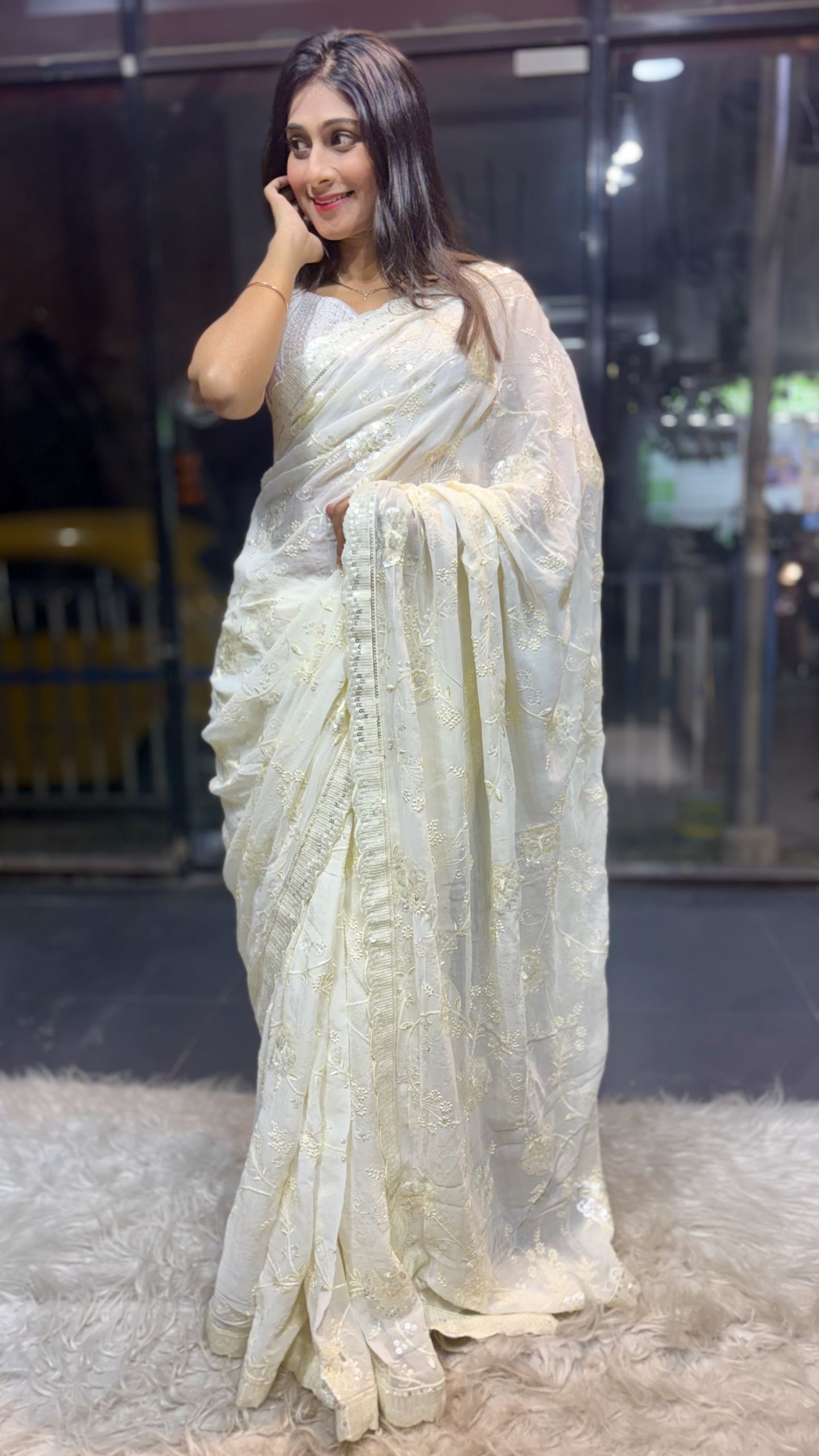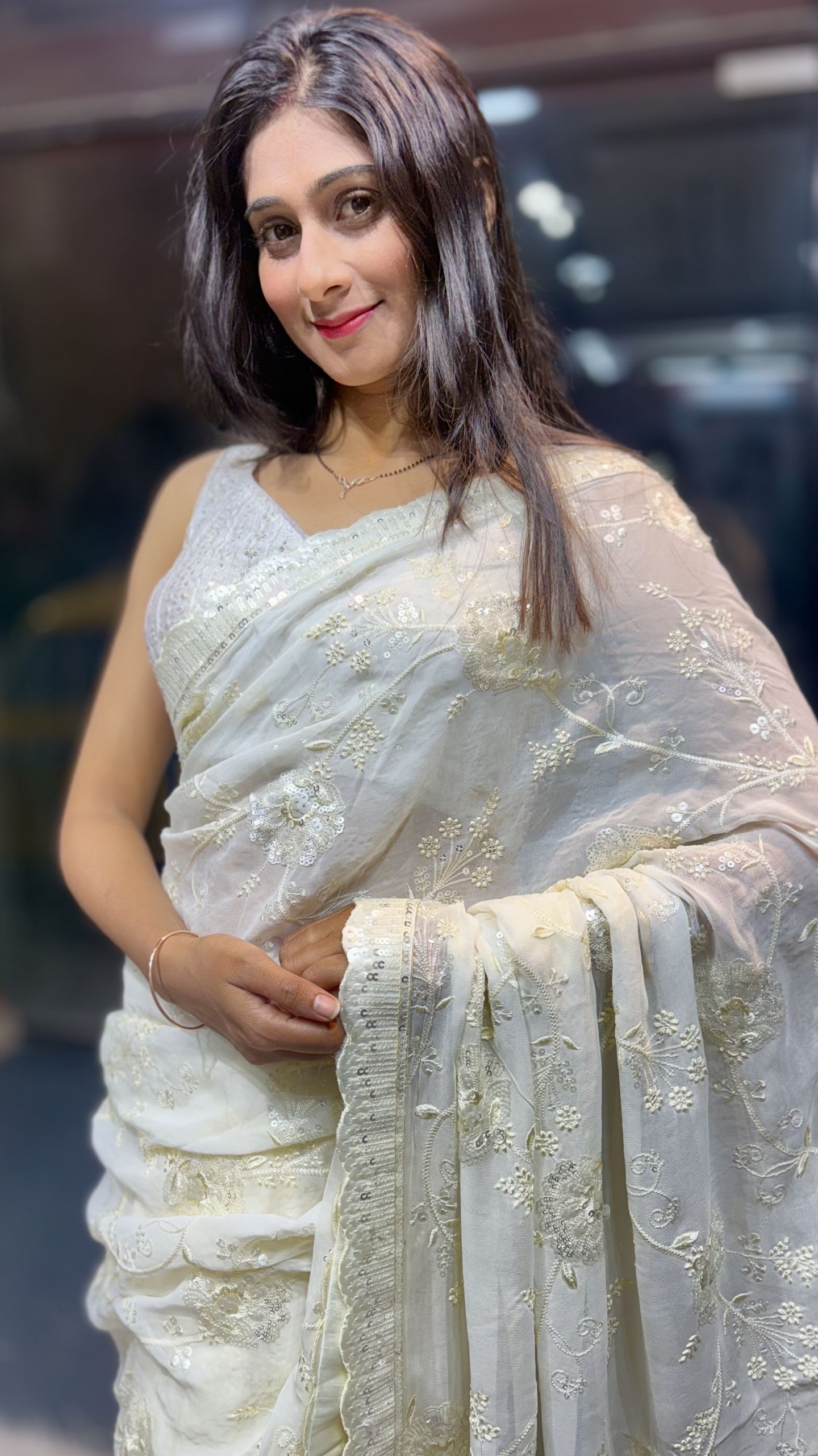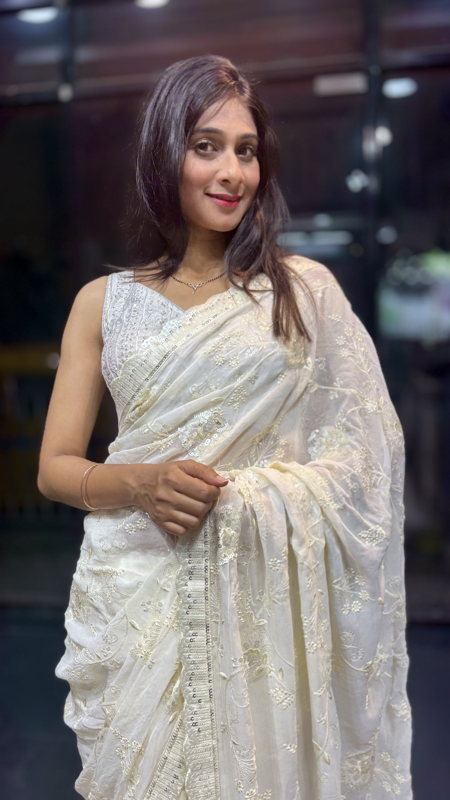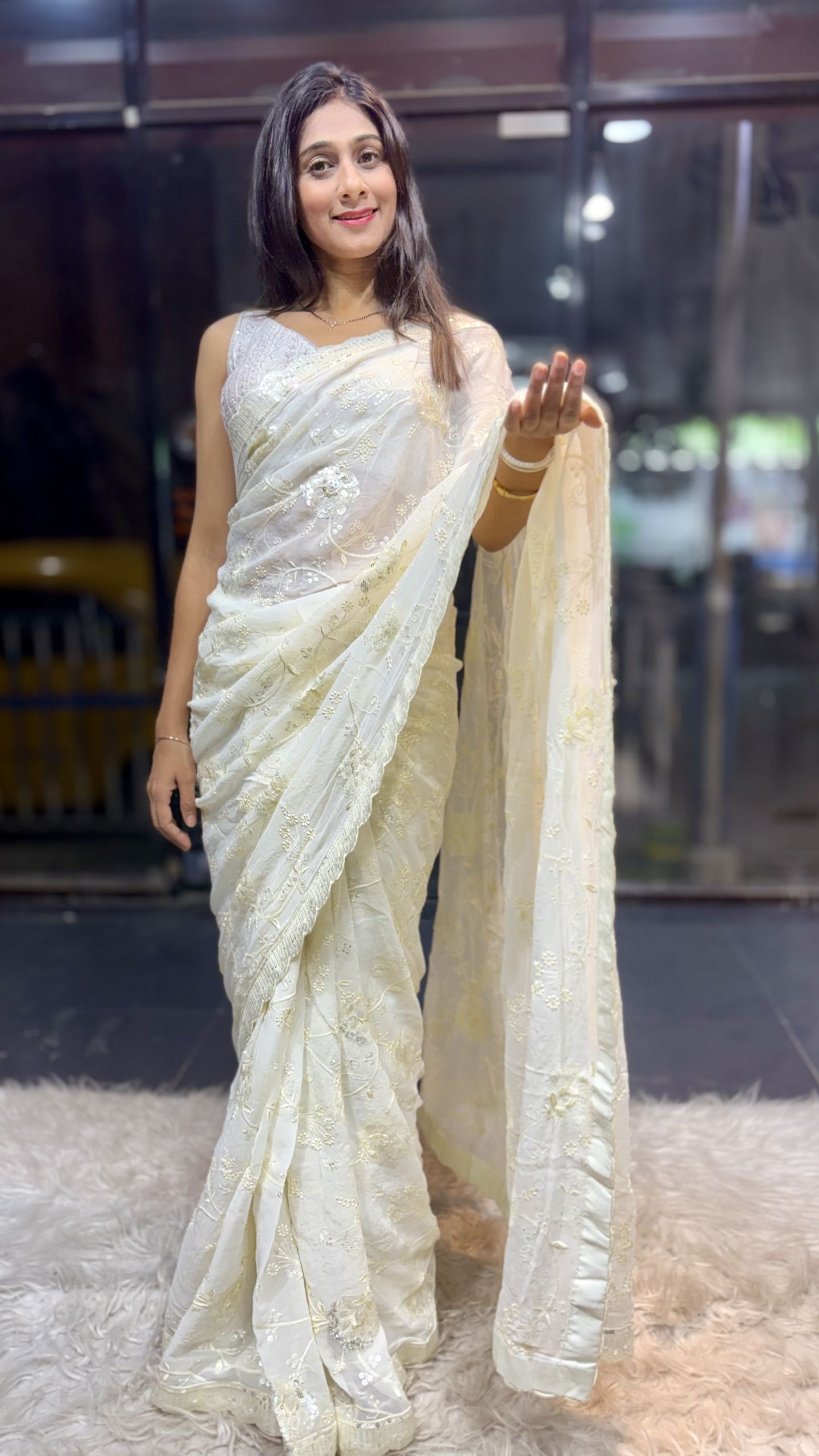 Graceful Georgette Chikankari Saree featuring allover floral threaded jaal with subtle sequin highlights and a beautifully finished sequin scalloped border. Light, elegant, and perfect for festive and evening wear.
