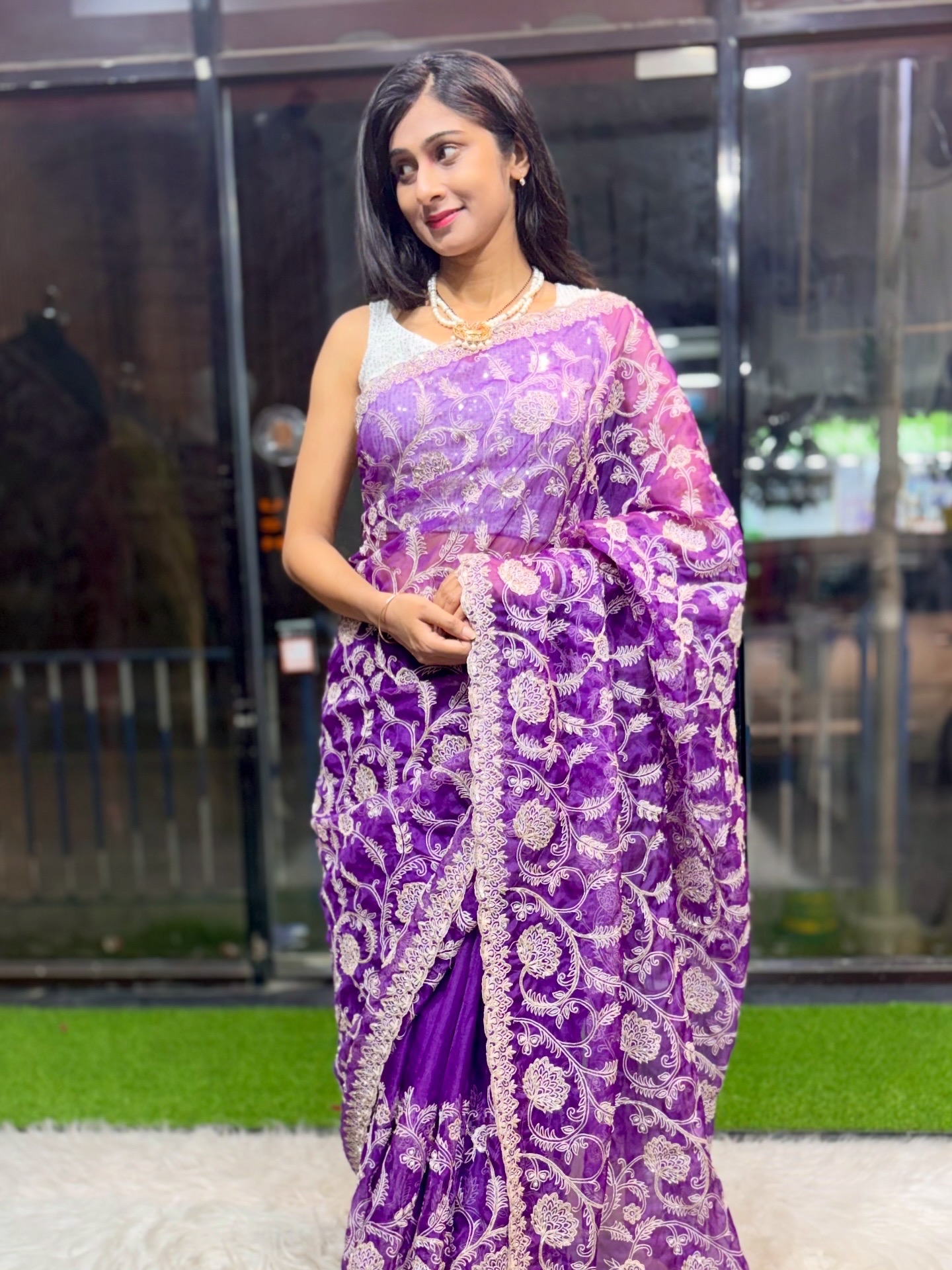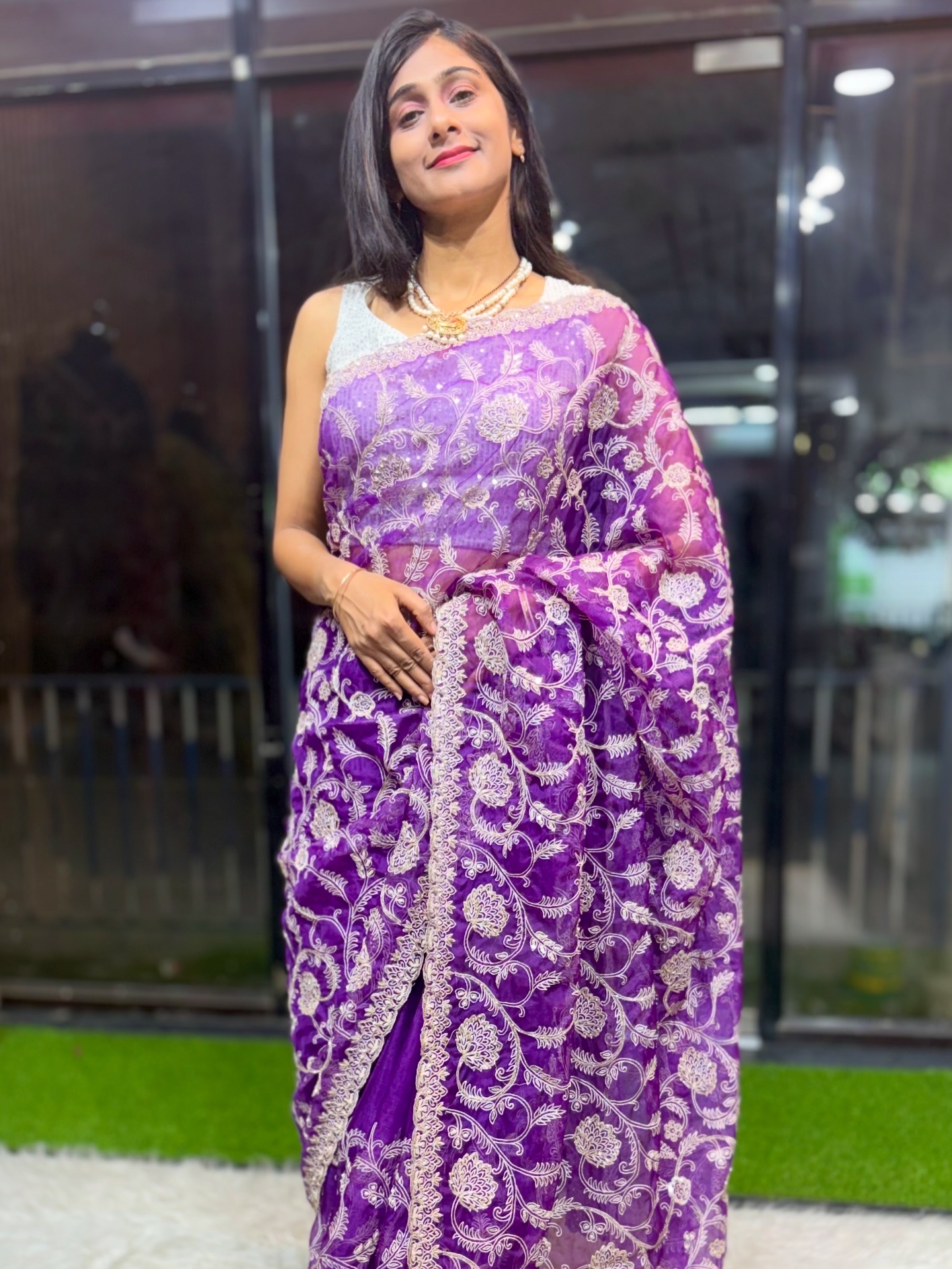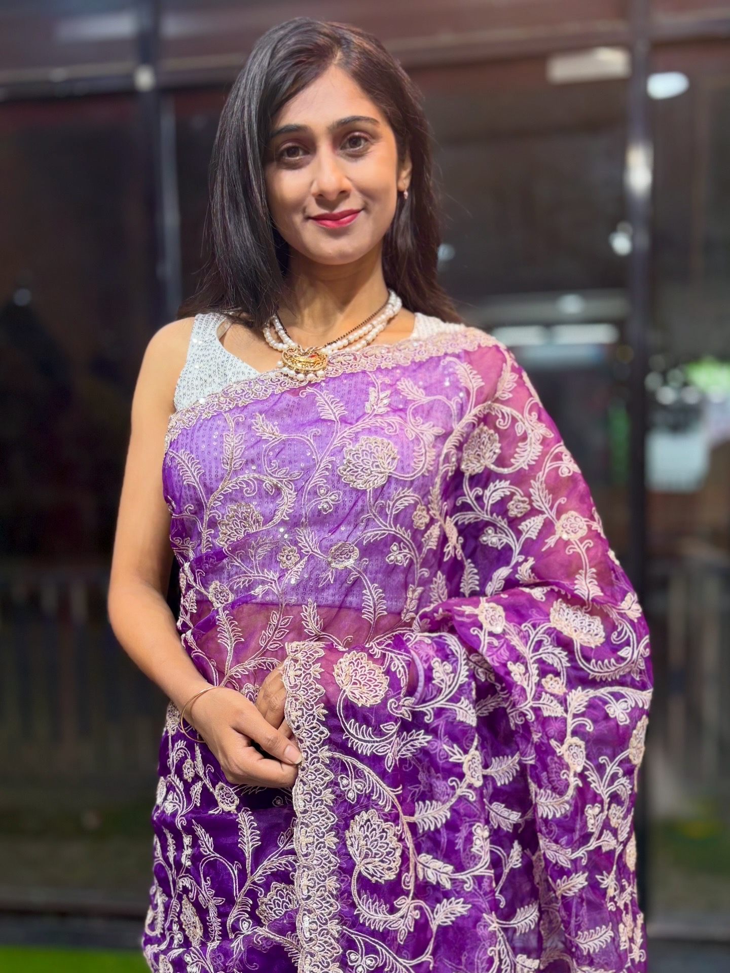 A perfect blend of subtle shine and intricate handwork—this saree elevates festive, wedding, and elegant evening looks with effortless grace and timeless charm.